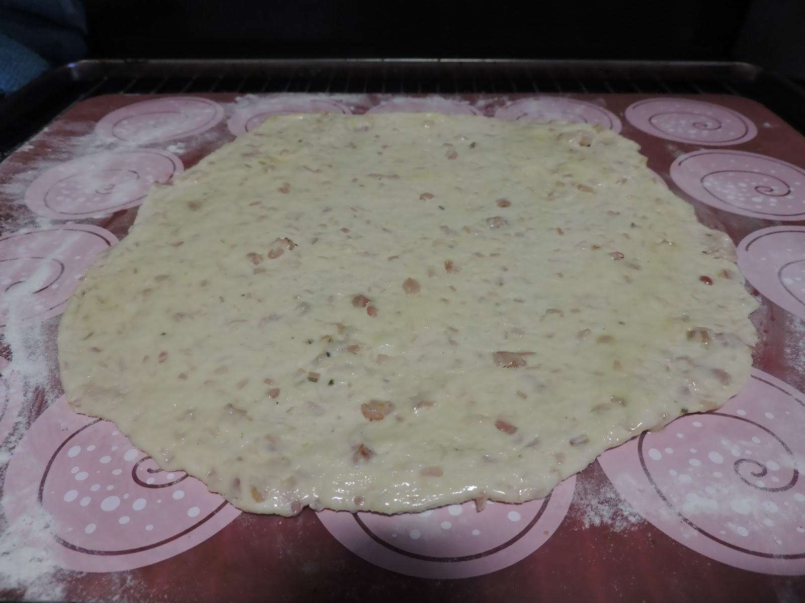 - Cogemos las 5 más grandes. Estiramos la primera sobre la superficie en la que vamos a hornear (en mi caso una lámina de silicona, pero podemos hacerlo igualmente con papel de hornear). Hacemos un círculo (aproximado), y pincelamos con mantequilla derretida.